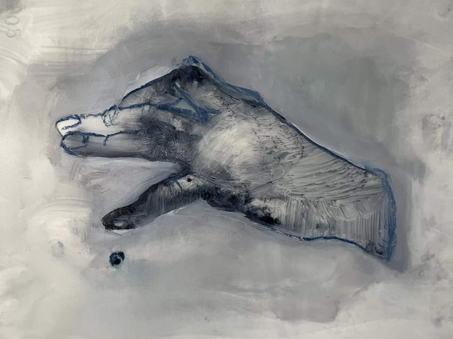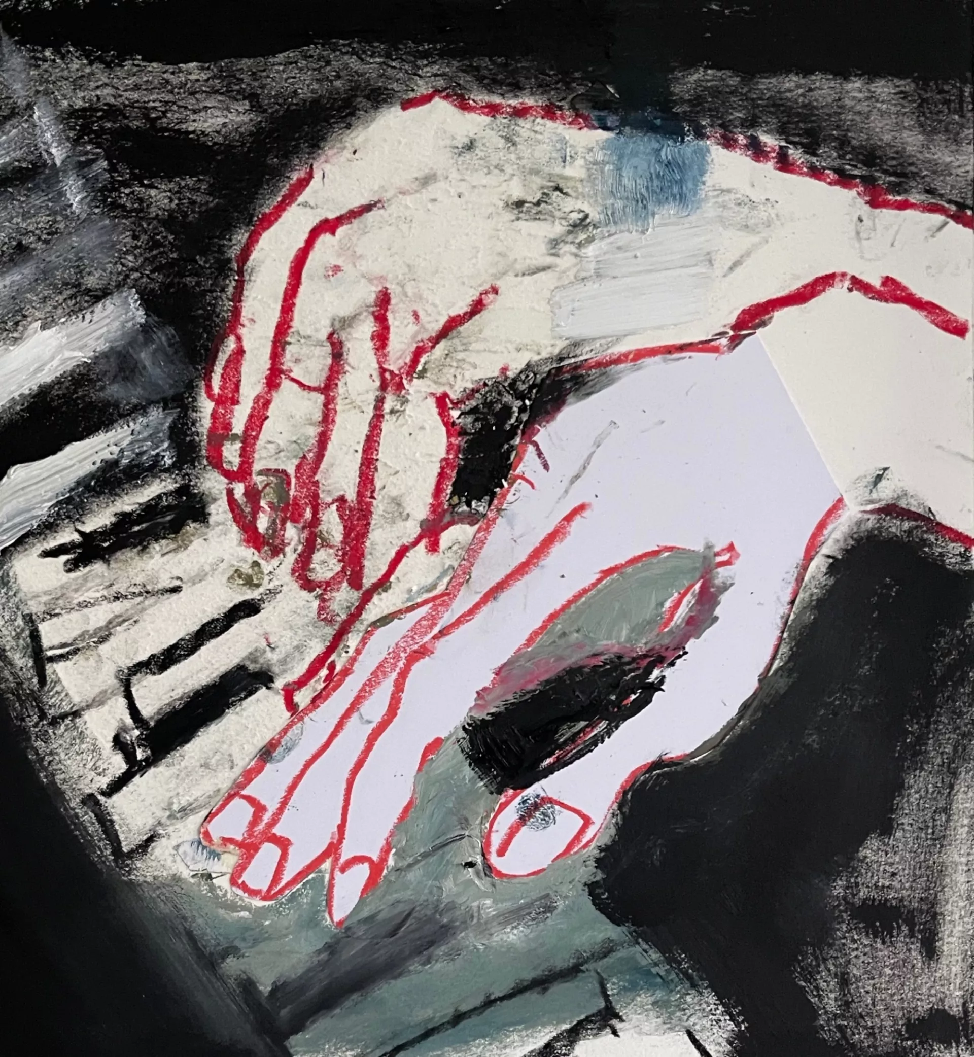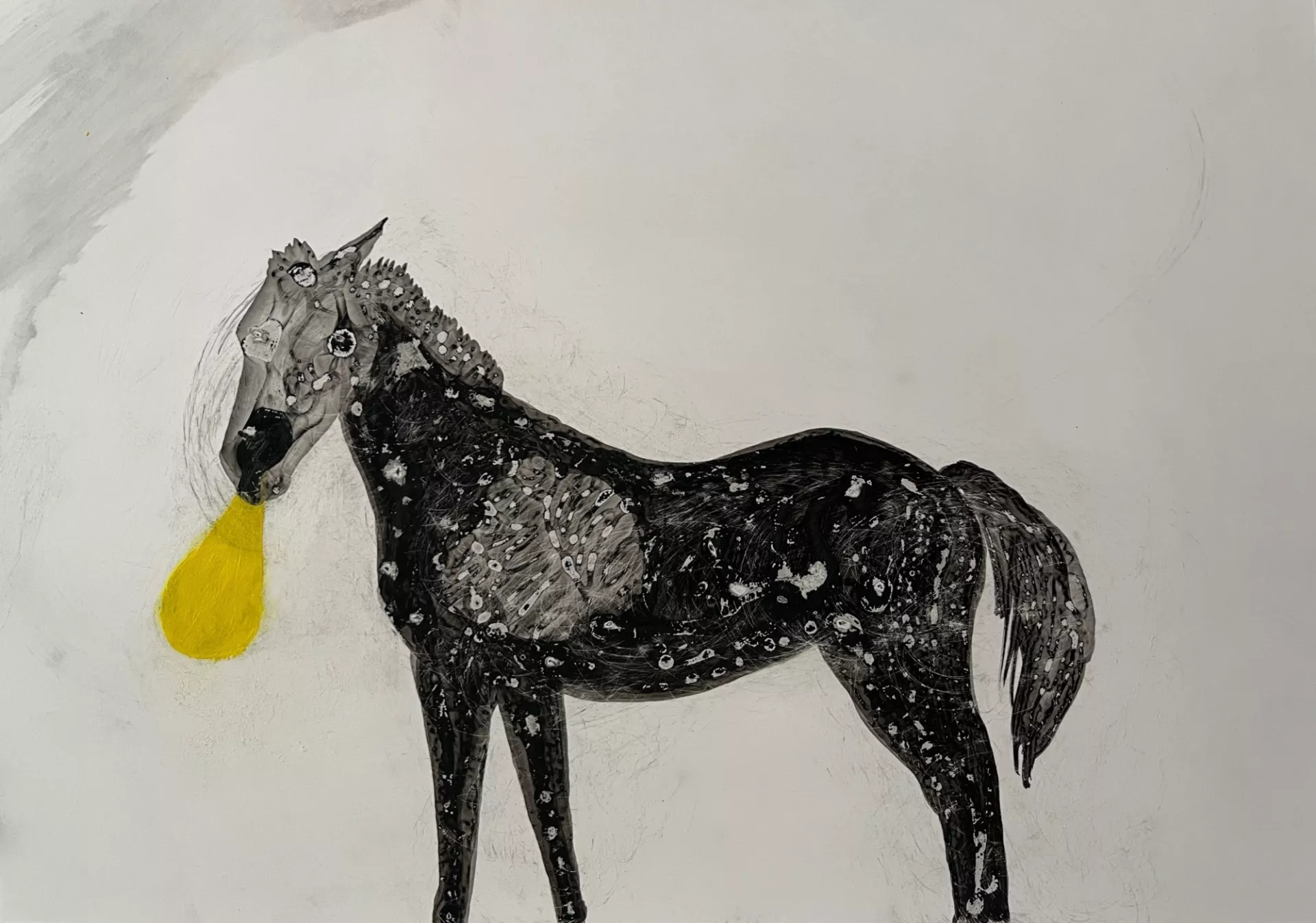 Laure Carré’s (°1968) paintings come from within—from the belly, to be precise—from the seat of the soul, reflecting its states. You must remember this when you look at her small and large formats, filled with dogs and wild horses, cowboys and unisex boxers, high mountains and low skies. Laure Carré places equal importance on morning thoughts and distant memories. Each painting, each collage, is a mystery.