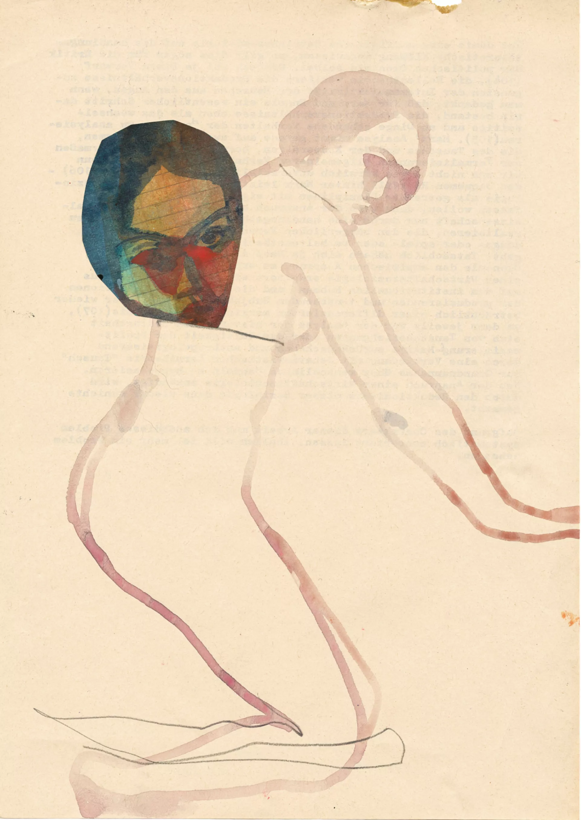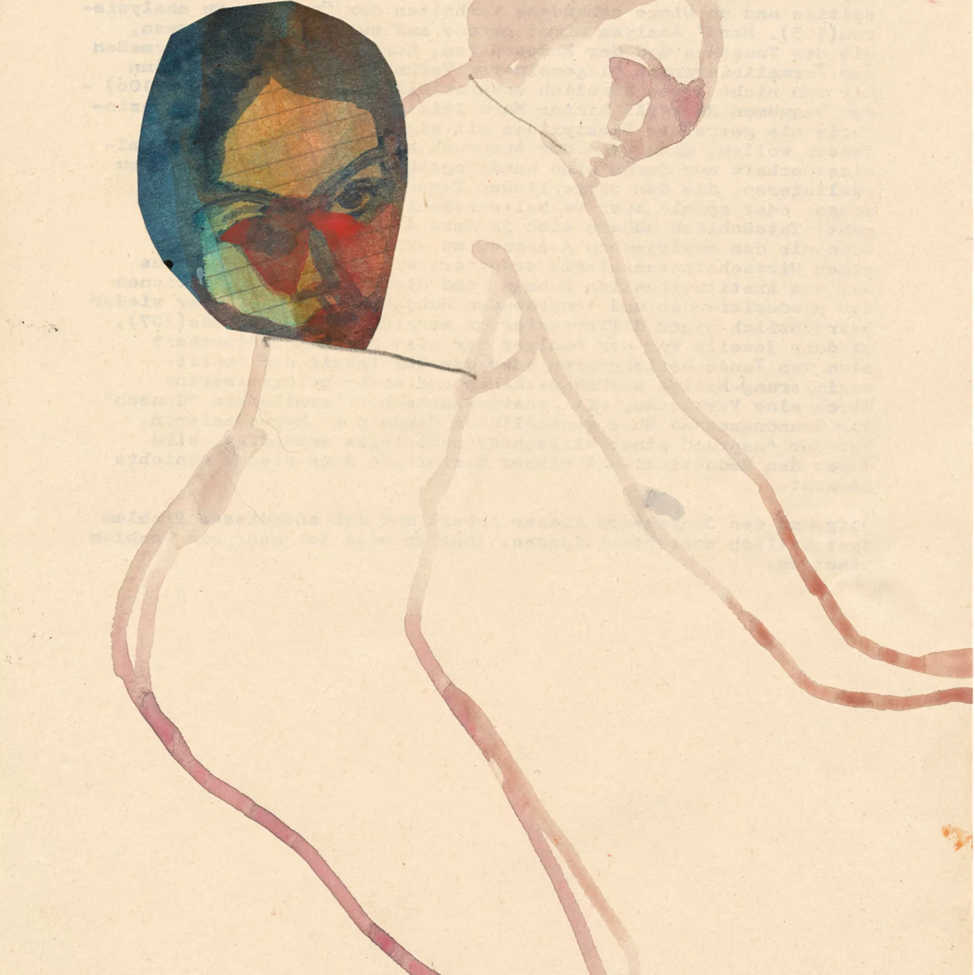 Ink, acrylics, watercolour and thread on found paper