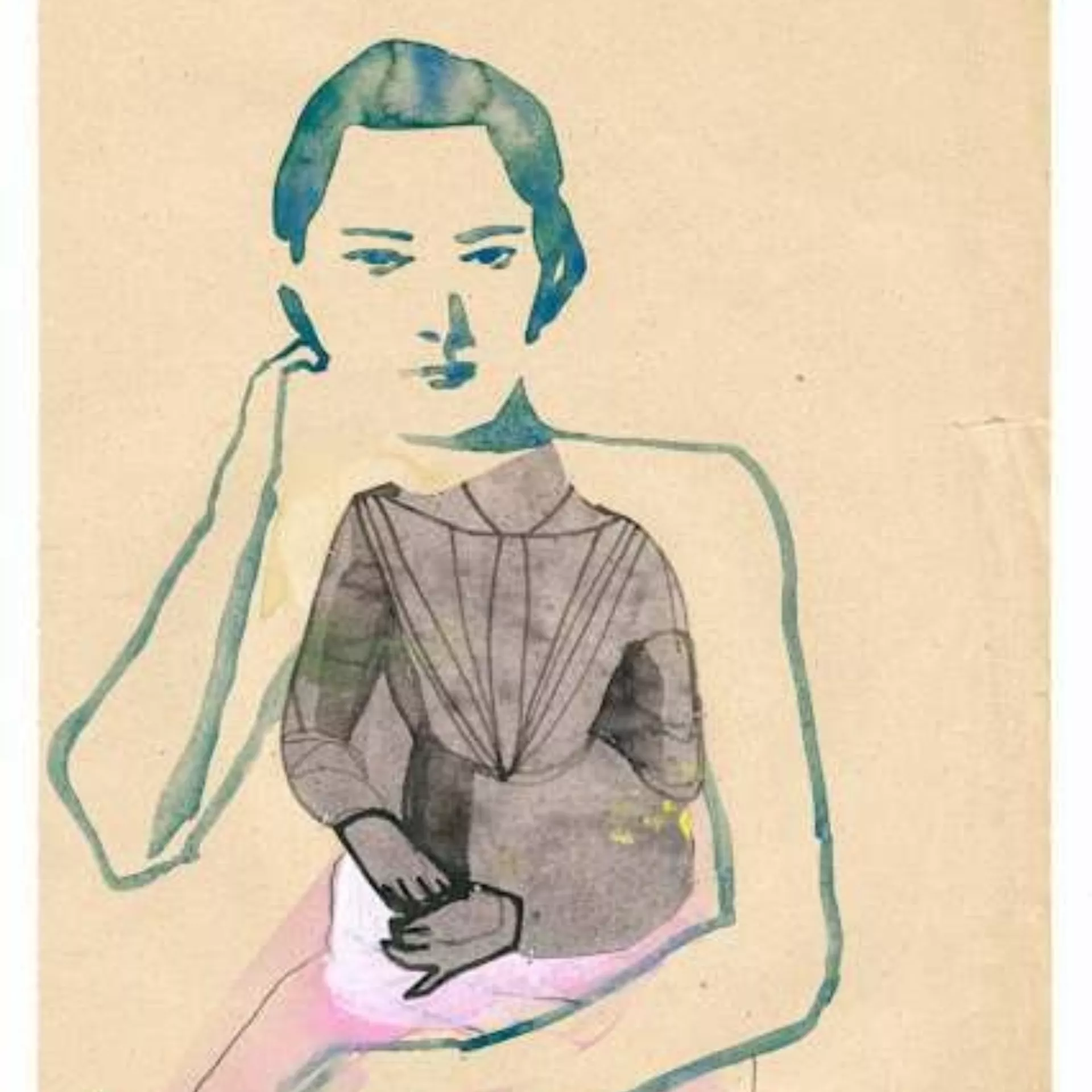 Ink, watercolour and thread on found paper, collage