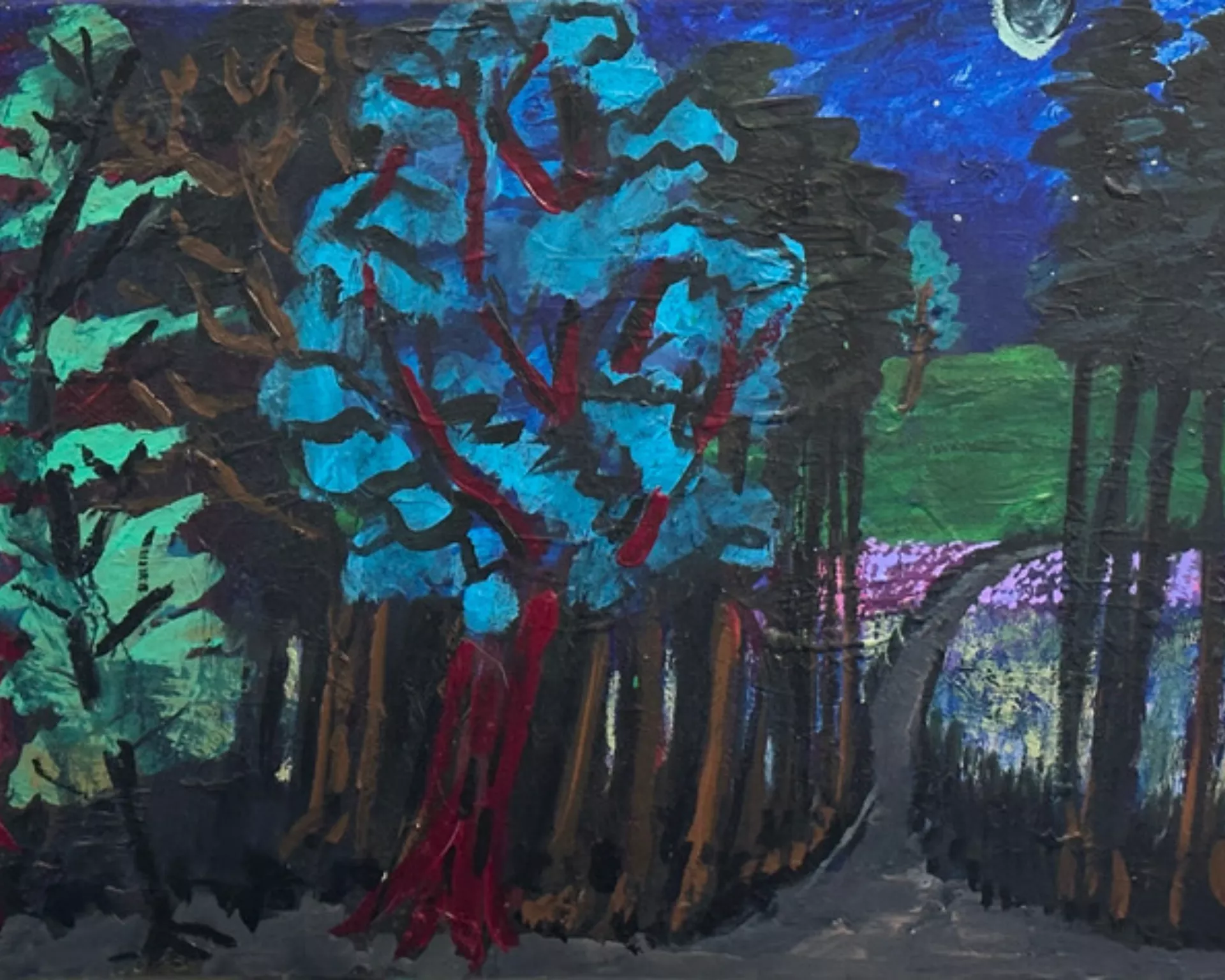 King’s process is one of layering and accumulation. He builds his surfaces with rich impasto, incorporating sand and thick paint to evoke the sedimentary history of fertile marshes. His impressionistic use of dotted leaves captures the fleeting vitality of trees bathed in sunlight. Foliage ignites with fiery golds and reds, while cool geometries of rock and lunar twilight emerge—sometimes within the same canvas.