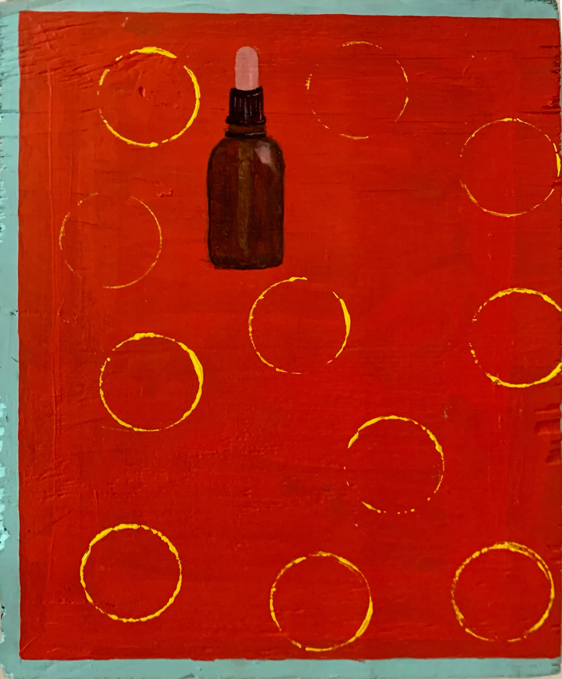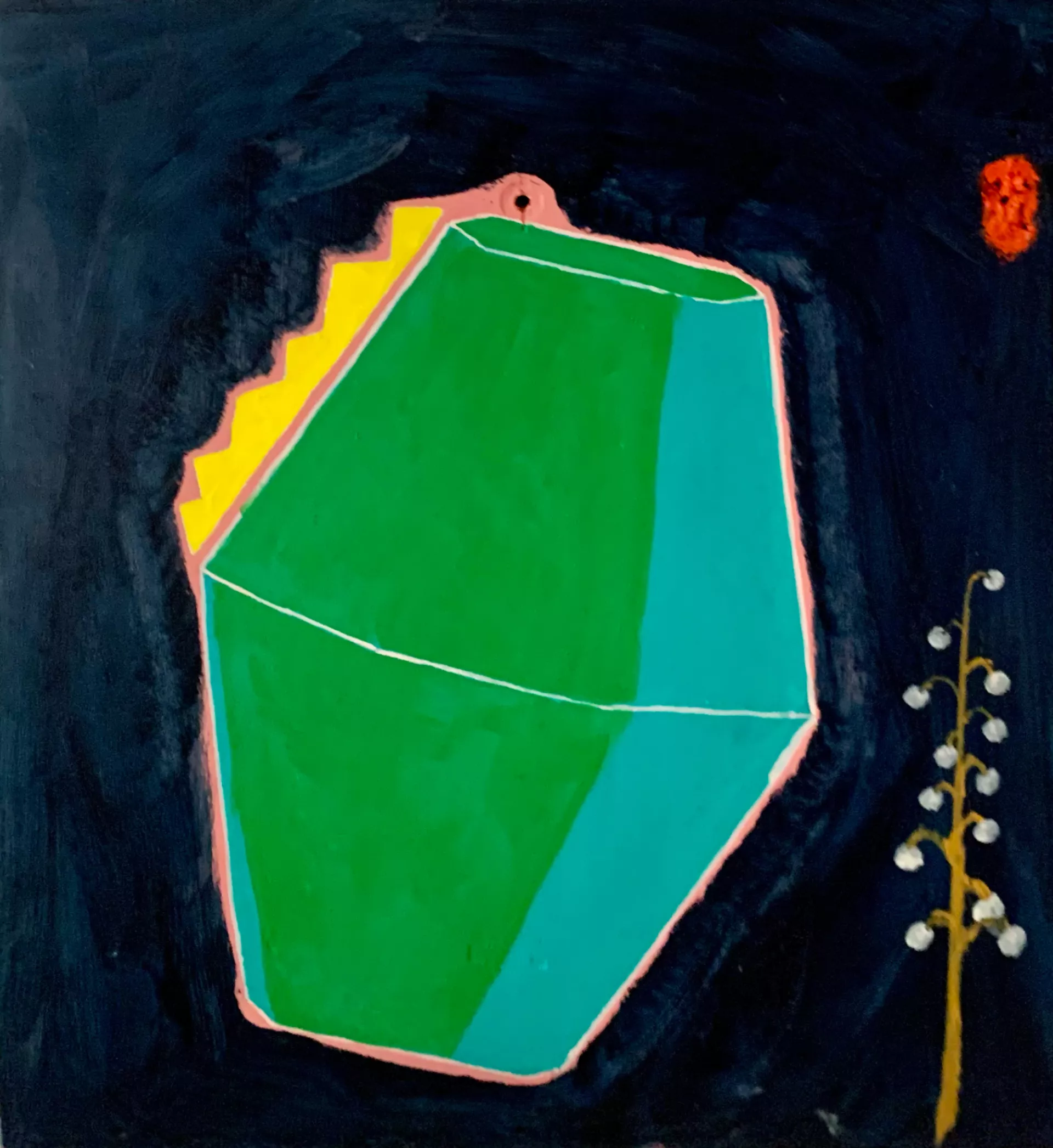 The scale is always small to modest. The palette is consistently vivid, less a painter’s palette than that of plastic objects. The surfaces are determined not only by actions and accidents of paint, but by the fact that the support is often ruddy or irregular, scavenged material. Many paintings include figures, quotidian objects, and abstract forms rendered in flat color. There are also animals, words, and a minimally articulated illusion of landscape or interior.