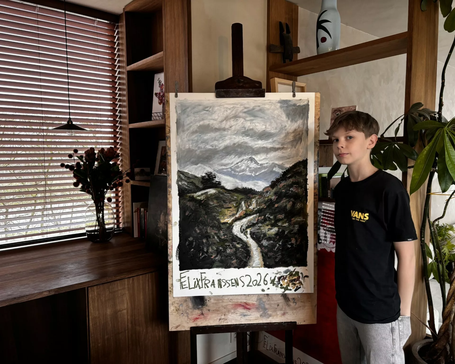 Felix Franssens is an 11-year-old artist from Beernem, Belgium, who has been passionately drawing and painting since kindergarten. Despite his young age, he has developed a remarkably distinctive style and strong technical skill. He creates both expressive portraits and large abstract works, often using oil pastel and oil paint. Felix draws inspiration from old masters such as Caravaggio, Rembrandt, Jan van Eyck, and René Magritte, studying their techniques to further develop his own artistic language. He works intensively in his own studio, experiments with materials, and has already held several exhibitions in his region, establishing himself as an exceptional young talent in the Belgian art scene.