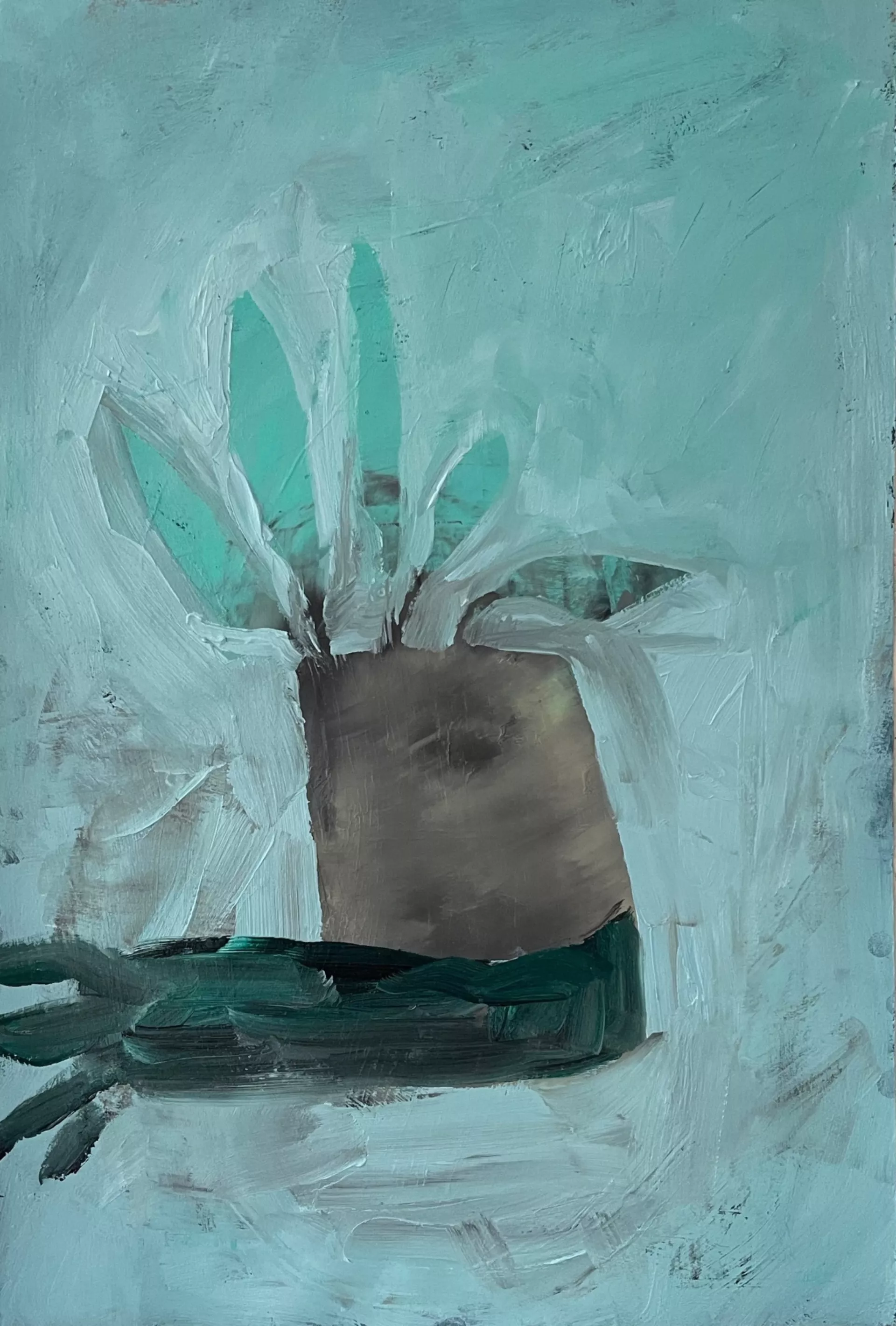 Laure Carré’s (°1968) paintings come from within—from the belly, to be precise—from the seat of the soul, reflecting its states. You must remember this when you look at her small and large formats, filled with dogs and wild horses, cowboys and unisex boxers, high mountains and low skies. Laure Carré places equal importance on morning thoughts and distant memories. Each painting, each collage, is a mystery.