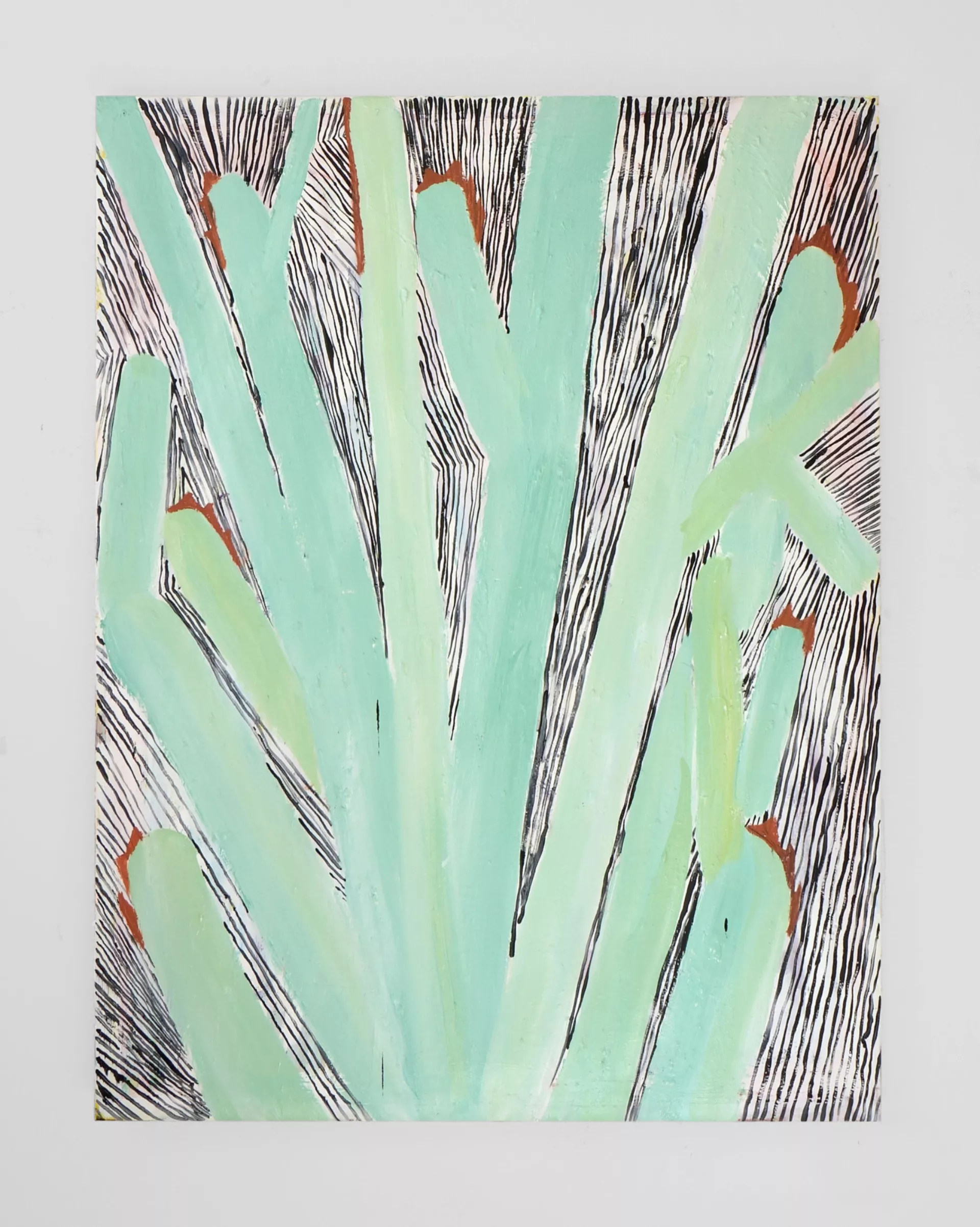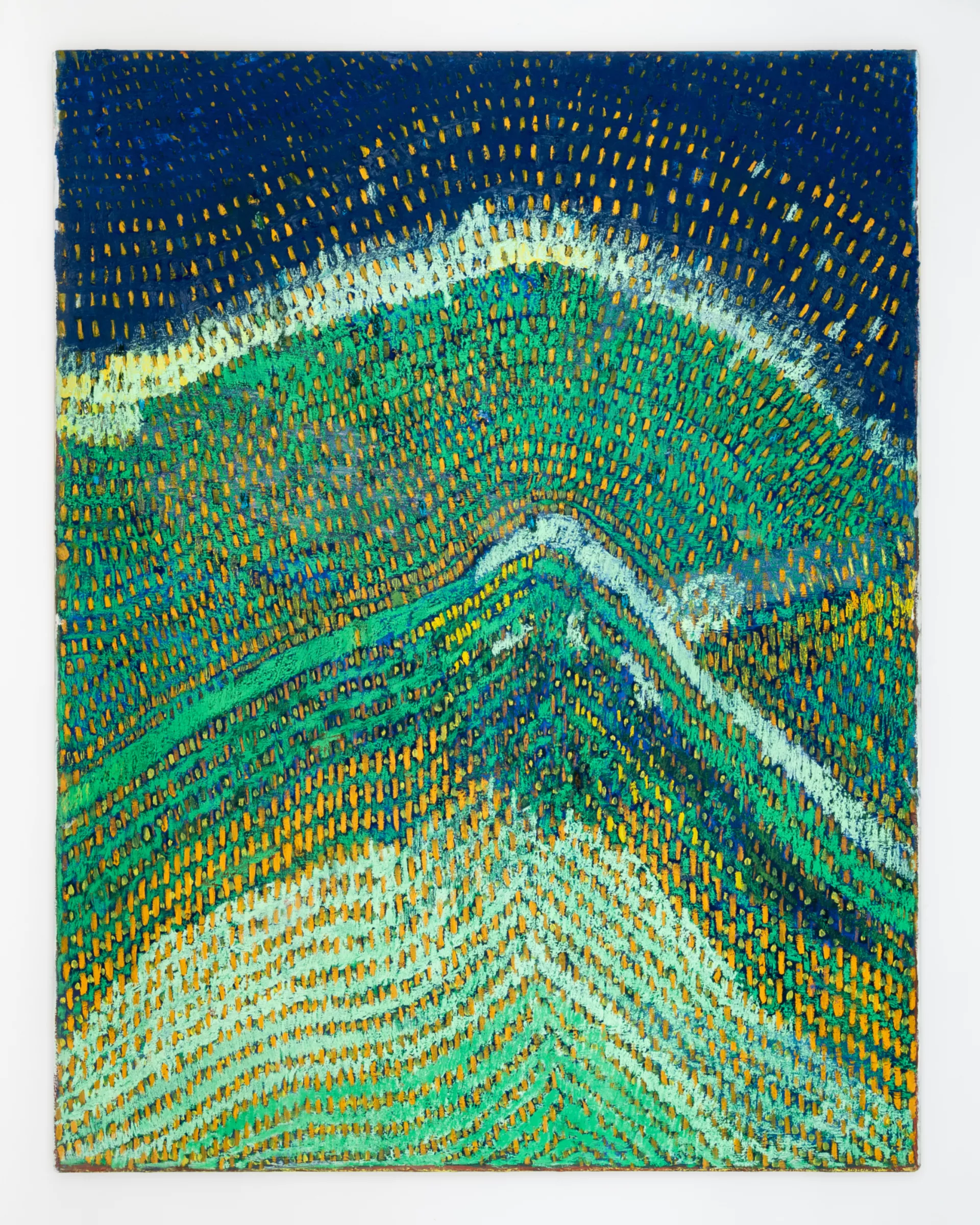Texture is central to her practice. By mixing oil paint with talc, the oil recedes, leaving only pure pigment behind—a matte depth in which one might almost dissolve. These muted planes are juxtaposed with glossy layers of paint that hold the viewer at a distance. Thus the canvas becomes a terrain of intimacy and detachment, closeness and withdrawal.