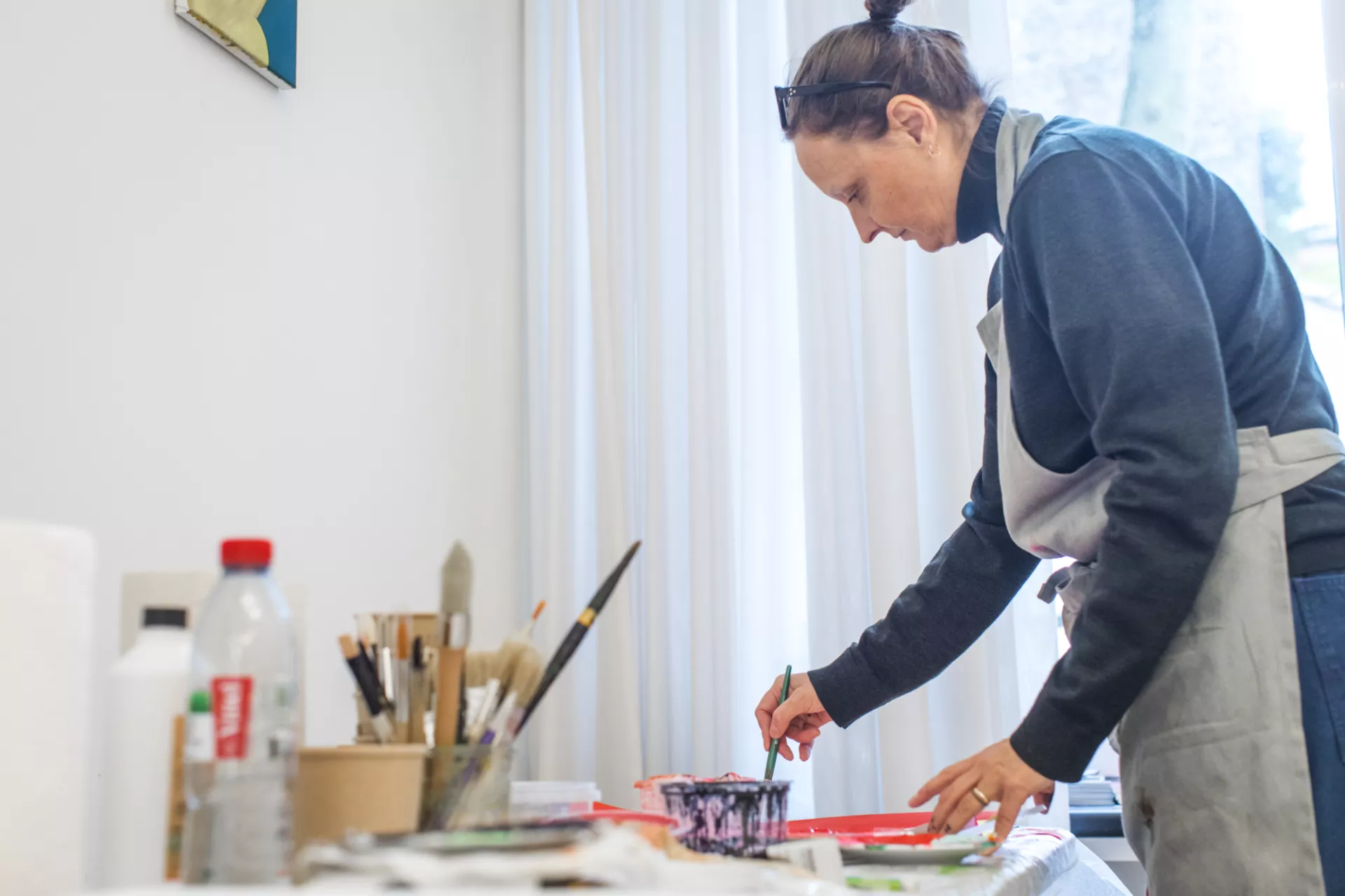 The works are not snapshots taken in an uncontrolled moment, as it is the case with street photography. No, the women pose willingly. The plain backgrounds of the paintings suggest a canvas in a studio, the sparse and sketchy props of a theatre. The women are represented at that precise moment, "the decisive moment", as Henri Cartier-Bresson would have called it. "The only moment they briefly allow us to look inside their heads," the artist explains. Their pronounced eyes should help us do this, as they are the windows to their souls. Somewhere underneath the thick layers of makeup and clothing lies their true identity. Because "the I's inside", Christina Zimpel knows it.