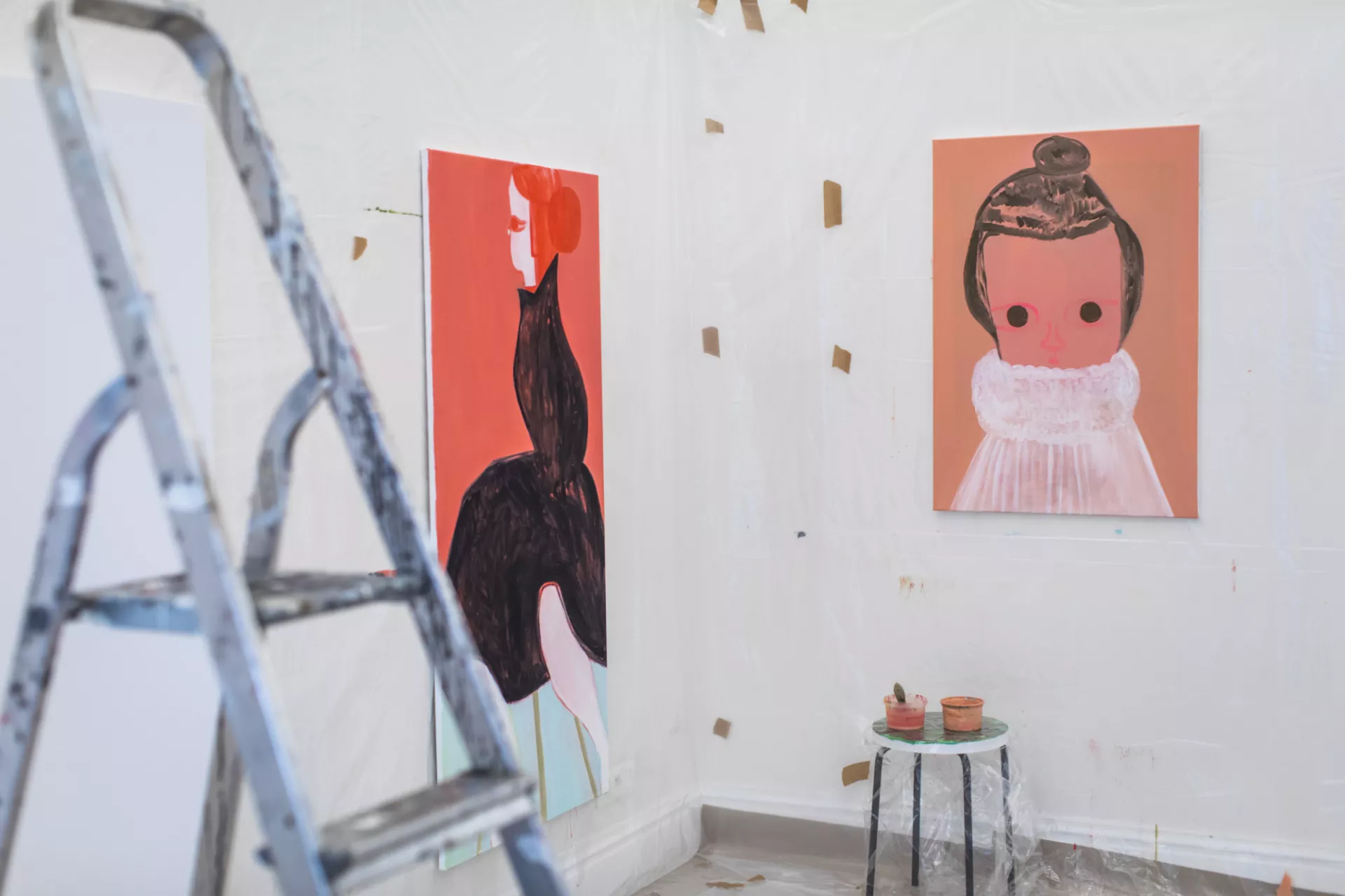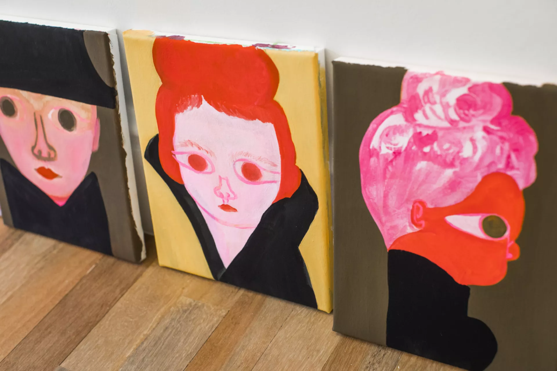 In her exhibition "The I's Inside", Australian artist Christina Zimpel (b. 1961, lives and works in New York) presents a series of enigmatic female portraits. They are the results of various interests and inspirations. Zimpel's intense, non-realistic use of color, and simplified, flat forms is reminiscent of the work of German Expressionists and Fauvists like Henri Matisse. The pink she frequently uses, is not a soft, feminine pink, but rather a subversive, fluorescent pink – like that of the punk of her youth. In turn, the hairstyles (hair worn in a bun) recall the seductive female figures of Henri de Toulouse-Lautrec. Finally, the shadowy silhouettes in black ink evoke the street photography of Vivian Maier.