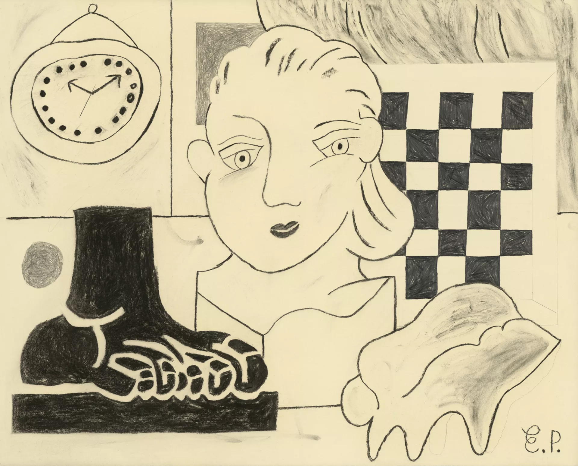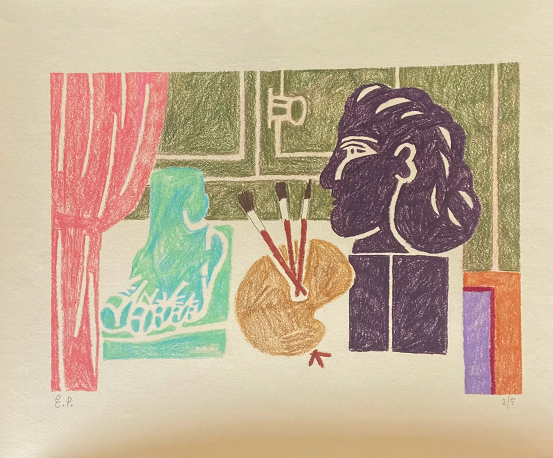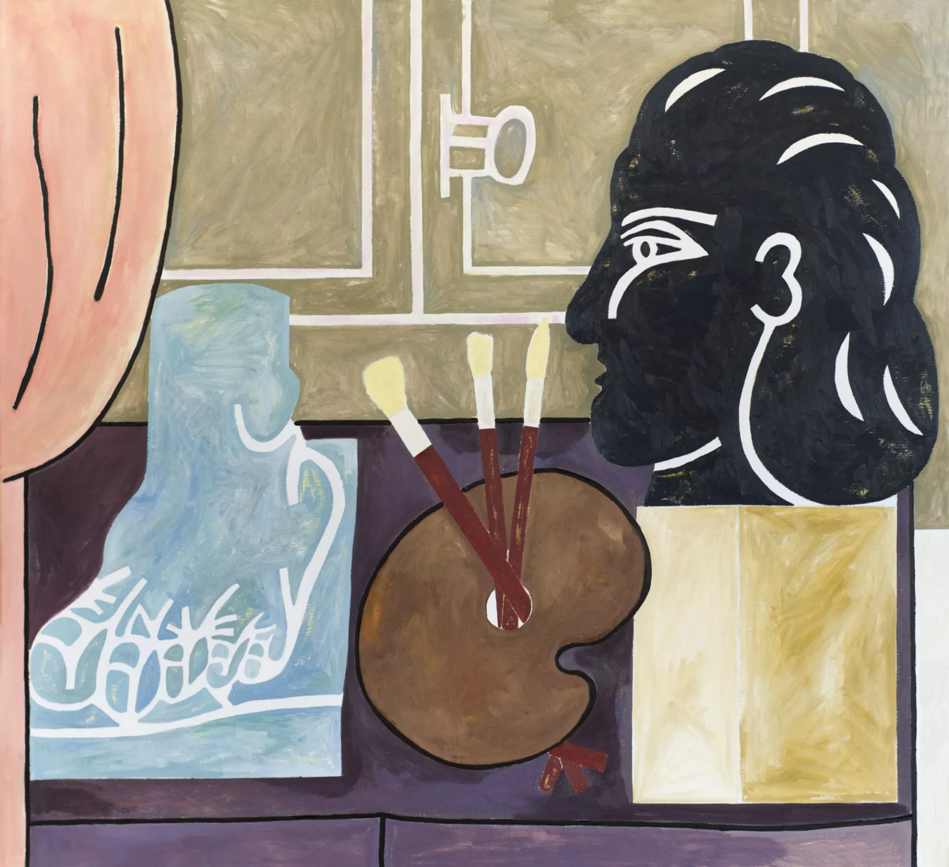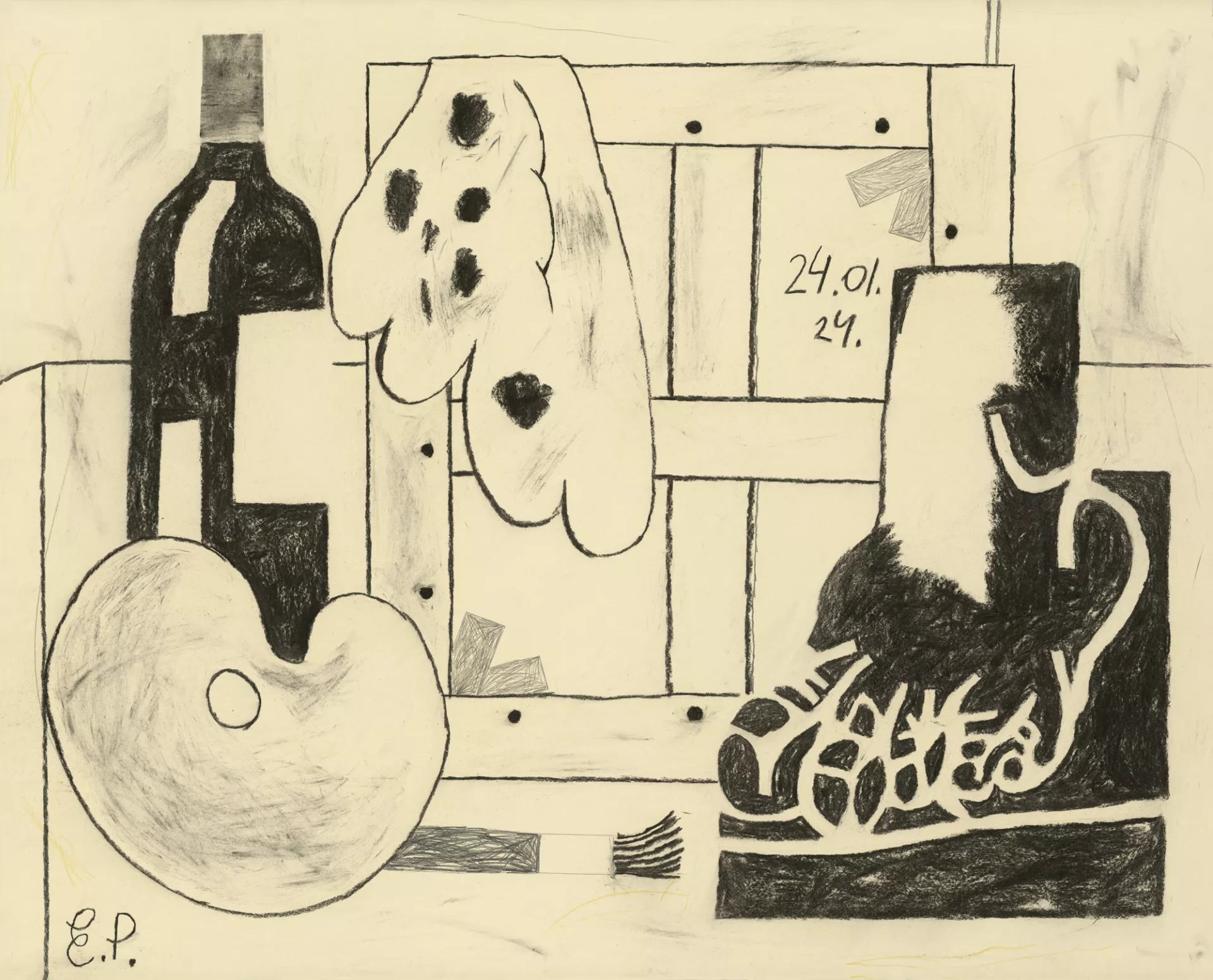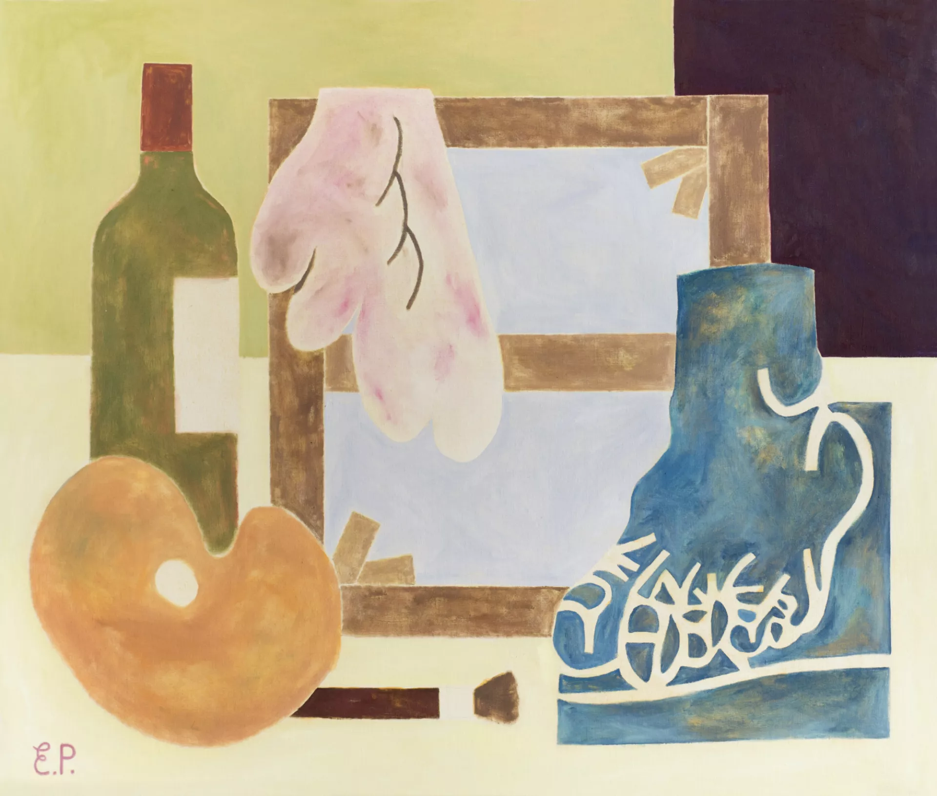 Throughout art history, images of artist studios have appeared frequently, often serving as representations of the creative process and offering us a glimpse into the artist's world. Rendered in grand compositions, they sometimes elevate the role and position of the artist as well. With examples like Johannes Vermeer, Claude Monet, Diego Velázquez, and Gustave Courbet, Eliza aligns herself with a rich painting tradition. These are large shoes to fill, but she does so with flair and careful consideration, as the still lifes from the studio are the result of thorough research and a long process of sketching and making preliminary studies. Like her illustrious predecessor Paul Cézanne, Eliza views the still life as a means to reconsider spatial organization and geometric construction. In search of a harmonious composition, various objects are arranged in a deliberate manner. Like Cézanne, Eliza also abandons the realistic depiction of perspective and form, introducing a playful element into her work.