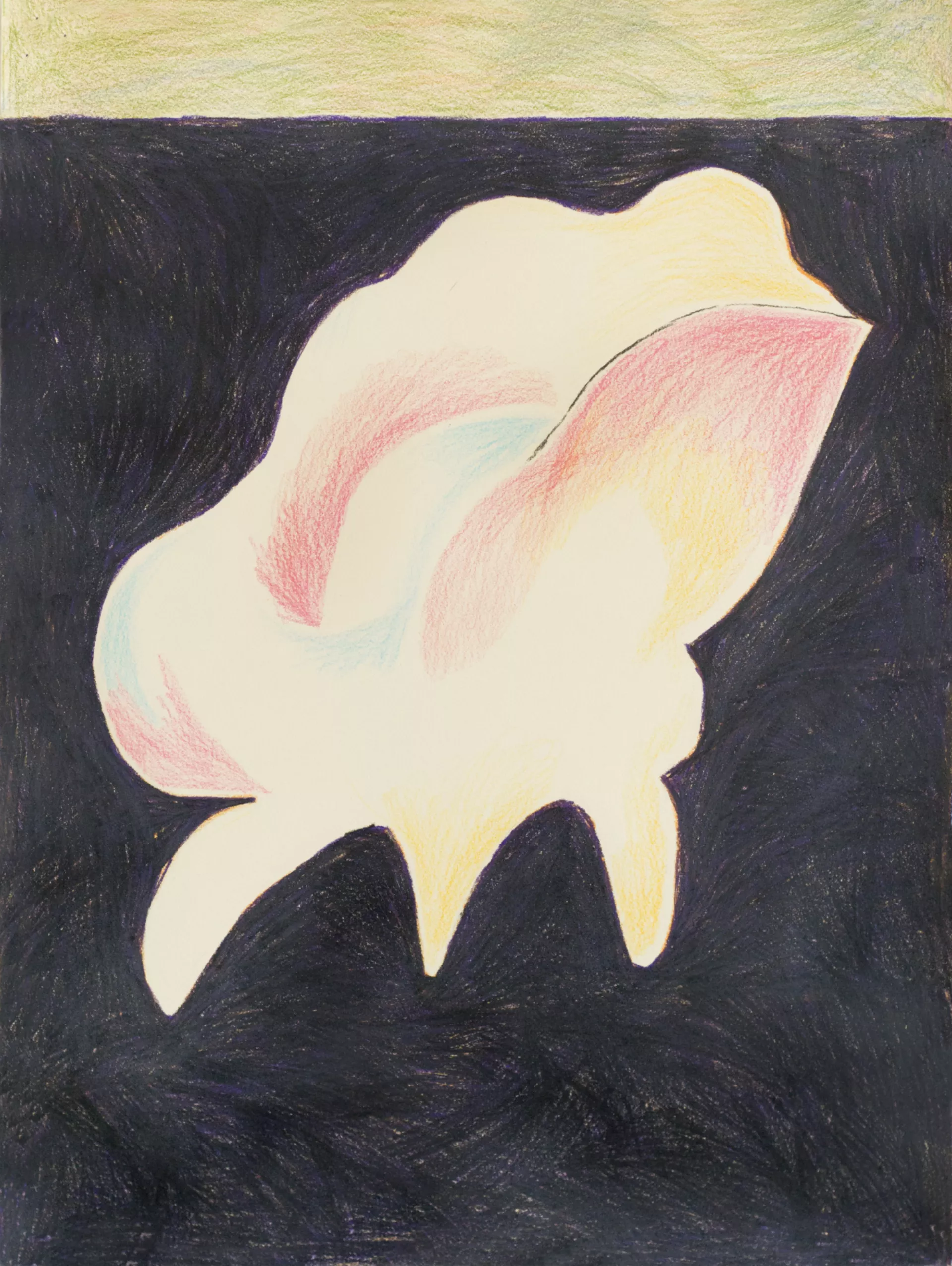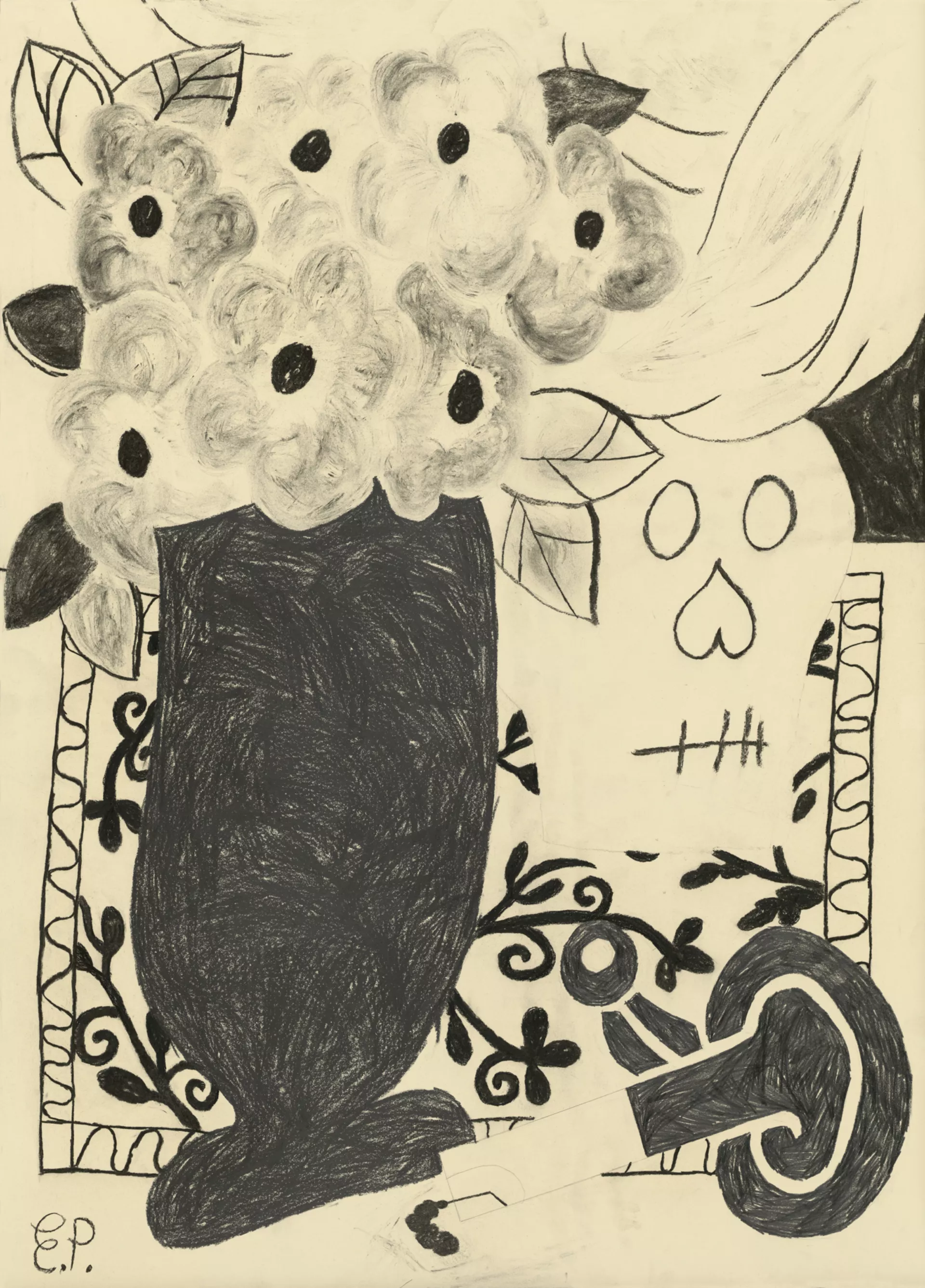 Metaphorical motifs take the lead in a spectacle staged in the studio. Wilted flowers, skulls, guitars, overripe fruit, playing cards, clocks, and extinguished candles highlight the fleeting and transient nature of human existence, reminding us of the vanity of worldly pleasures and possessions. Typical vanitas motifs are supplemented by objects from the studio, such as brushes, busts, painter’s palettes, canvases, books, as well as items from Eliza's daily family life with her partner: a basketball, a spider. Thus, the outside world enters the studio. However, it carries an ominous tone. Nocturnal animals, the moon, and a black dove point to a turbulent world that bursts the safe cocoon like a soap bubble. Gradually, objects in the studio begin to topple. A vase turns black, foreshadowing dark times and an unknown future. Abstract, insignificant shapes take on a threatening quality, like ever-expanding dark spots. For the first time, human presence appears in Eliza's work, in the form of a progressing shadow. Is it the shadow of the artist, her muse, or the viewer as an intruder?